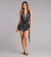 A blend of fluid print and flirtatious movement, this mesh mini dress delivers instant night-out magic. The abstract pattern flows across a stretchy mesh-lined base that smooths comfortably along the body. A plunging cowl halter neckline, accented with a polished hardware bead, adds soft drape and a touch of shine. The open back features a cascading panel that moves effortlessly, while the tiered ruffle hem brings playful volume to every step. Sleek, sultry, and perfectly undone—just the right kind of after-dark allure.