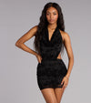 A blend of intrigue and elegance, this mini dress is crafted for moments that linger long after the night ends. The mesh-lined fabric is adorned with a velvet flocked floral pattern, adding soft texture and depth under dim lights. A draped cowl halter neckline leads into an open tie-back that bares the shoulders with effortless grace, while subtle side cutouts carve out definition at the waist. The bodycon silhouette and mini-length hem create a sleek, sculpted finish that feels modern and undeniably captivating.