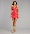 Created for evenings that revolve around you, this mini dress pairs shimmering sequins with a sculpted, curve-enhancing fit. The textured knit base adds subtle structure beneath all-over mini sequin embroidery, giving the dress a dimensional glow from every angle. A sweetheart neckline meets a halter strap for a lifted, elegant shape, while the partially open back adds a polished touch of allure. Finished in a sleek bodycon silhouette, it delivers effortless impact for nights that go late.