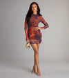 • Bold Statement: The abstract animal print creates an unforgettable look that stands out in any crowd • Daring Details: Sheer mesh sleeves with slit accents offer a modern, fashion-forward twist on classic sophistication • Confident Fit: The bodycon silhouette and mock neckline create a powerful, curve-hugging profile that feels as amazing as it looks • Night Out Ready: Perfect for evenings when you want to make an entrance—pair with sleek heels and minimal jewelry to let the dress shine